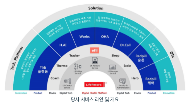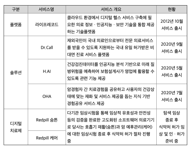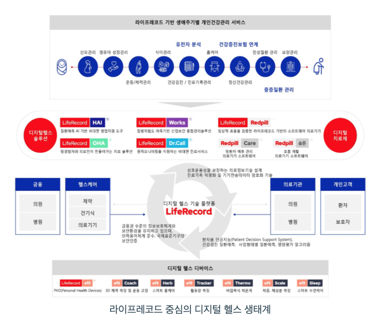 당사는 ① 클라우드 환경에서 고객사(3rd Party)가 디지털 헬스 서비스와 솔루션을 효율적으로 개발하고 안정적으로 운용할 수 있도록 의료 정보ㆍ인공지능ㆍ보안 기술을 통합 제공하는 디지털헬스 기술플랫폼 사업과 ② 라이프레코드를 활용한 자체 응용서비스인 디지털헬스 솔루션사업 및 ③ 임상적 유효성을 검증한 라이프레코드 기반의 소프트웨어 의료기기(SaMD, Software as a Medical Device)인 디지털치료제 사업을 영위하고 있습니다.