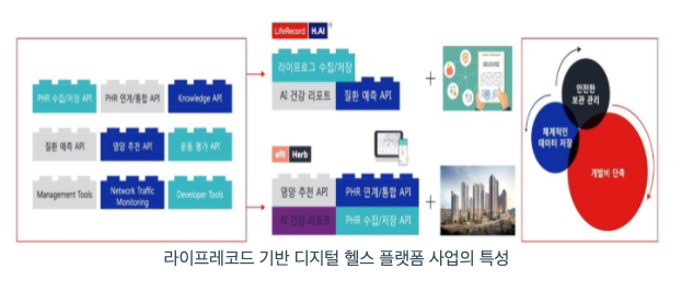 다양한 디지털 헬스 도구를 통해 개인건강에 대한 학습능력인 헬스 리터러시(Health Literacy)를 향상시키고 헬스케어에 적극적으로 참여하는 능동적 의료소비자가 증가하기 위해서는 의료기관에 분산되어 있는 진료기록, 라이프로그(Life-log), PGHD(환자유래건강데이터), 유전체 분석기록 등 개인건강데이터의 자유로운 이동, 안전한 저장, 분석 및 활용에 대한 지식과 노하우 및 데이터 기반 혁신기술(사물인터넷, 클라우드컴퓨팅, 빅데이터, 모바일, 인공지능 등)이 필요하나 여전히 전세계적으로 관련 인프라 및 기술이 부족한 상황입니다. 이에 따라 인프라의 초기 구축비용을 절감시키고 유연한 확장을 위해 클라우드 기반의 기술플랫폼 서비스의 수요가 증가되고 있으나 해외의 아마존웹서비스(AWS), 국내 네이버클라우드플랫폼(NCP) 등 대표적 퍼블릭 클라우드 사업자들이 구축한 기술플랫폼은 전(全) 산업 분야 사업자들에게 공통적으로 요구되는 필수기술들을 서비스하고자 범용적으로 설계되어 디지털헬스 전문 기술 및 보안체계가 미비하며 디지털헬스 전문 기술플랫폼 서비스 제공에 한계가 존재합니다. 따라서 개인정보 수집 체계를 구축하고 다양한 형태의 데이터 간 상호운용성을 갖춘 디지털헬스 전문 기술플랫폼에 대한 개발환경 및 상용화 필요성이 증가하고 있습니다. 당사는 설립 후 약 8년간 의료기관과의 협업 및 주요 R&D 정부 과제 수행을 통해 기술력/안전성/안정성을 검증한 국내 독보적 디지털헬스 기술플랫폼 라이프레코드를 개발하여 보유하고 있습니다. 라이프레코드는 다양한 형태의 개인건강데이터 간에 상호운용성을 보장하는 의료정보기술(Medical Informatics Technology) 기반으로 설계되어 클라우드 환경에서 디지털 헬스 서비스 구축에 필요한 핵심 기술을 블록화해 통합 제공하는 기술플랫폼으로 보험사 등 디지털 헬스 산업에 진출하고자 하는 3rd Party가 효율적인 시간과 비용으로 개발하고 안정적으로 운용할 수 있는 최적의 기술 인프라를 제공합니다. 블록화된 핵심 기술은 의료정보와 건강기록, 지식처리, AI 등의 핵심기술을 바탕으로 개인건강데이터(PHR)의 생성 및 기록, 수집 및 연동, AI 분석, 관리를 위해 필요한 기능을 디지털헬스 서비스를 API 형태로 구성하고 있습니다.