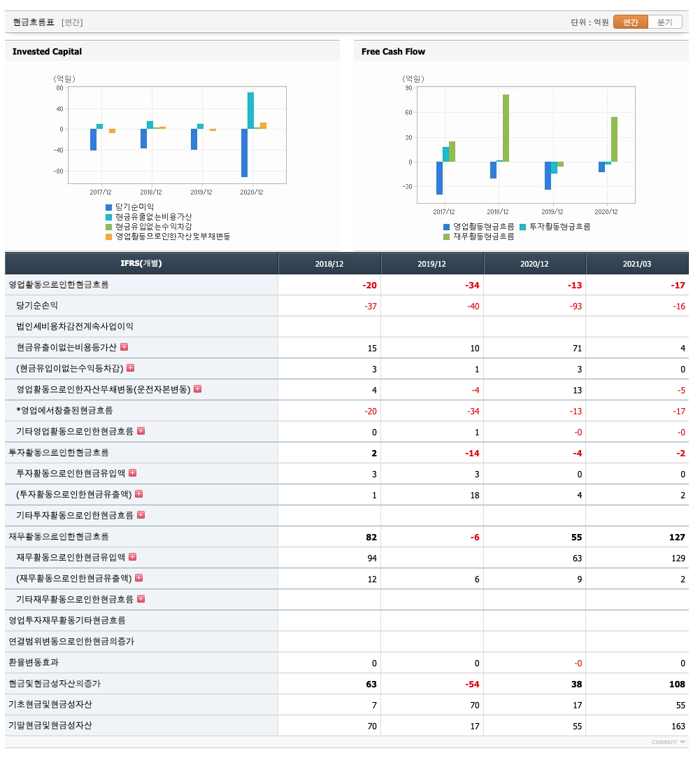 영업활동 현금흐름 : 2018년 -20억원, 2019년 -34억원, 2020년 -13억원, 2021년 1분기 -17억원으로 영업활동 현금흐름이 원활하지 않습니다.