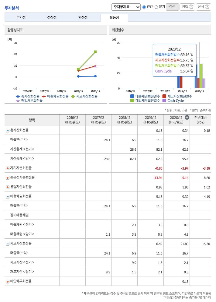 재고자산회전율(낮을 수록 좋습니다) : 2018년 약 1억원, 2019년 약 2억원, 2020년 약 0.3억원이고, 회전율은 2019년 약 6%, 2020년 약 21%로 급등하였습니다.
