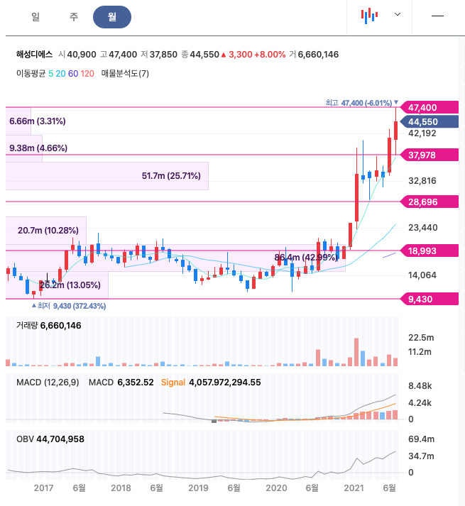 해성디에스는 20년 12월에 주가가 급등하였고, 지속적으로 우상향하여 21년 7월 47,400원을 찍었습니다.