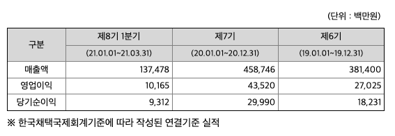 당사는 글로벌 경기침체 우려와 국내외 경쟁사의 증가로 경쟁이 치열해지는 어려운 상황을 극복하고, 기존 고객과 신뢰 및 우수한 품질 경쟁력을 바탕으로 한 영업활동 및 시장변화에 민첩하게 대응한 전략을 통해 괄목할만한 매출 성장으로 당기(2021.01.01~2021.03.31) 중 연결 재무제표 기준 매출액 1,375억원, 당기순이익 93억원을 실현하였습니다. 또한 당사는 현재에 안주하지 않고 더욱 적극적인 영업활동을 전개하여 신규 고객을 발굴하고 매출액을 증가시킴과 동시에 효율적인 업무 프로세스 구축, 원가절감을 통해 수익성 극대화를 도모하고 있습니다.