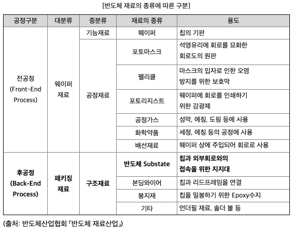반도체 재료산업은 공정구분에 따라 크게 '웨이퍼 재료'와 '패키징 재료'로도 구분하며, 반도체 구성단계에 따라서는 '기능재료', '공정재료', '구조재료'로 세분화하여 구분할 수 있습니다.