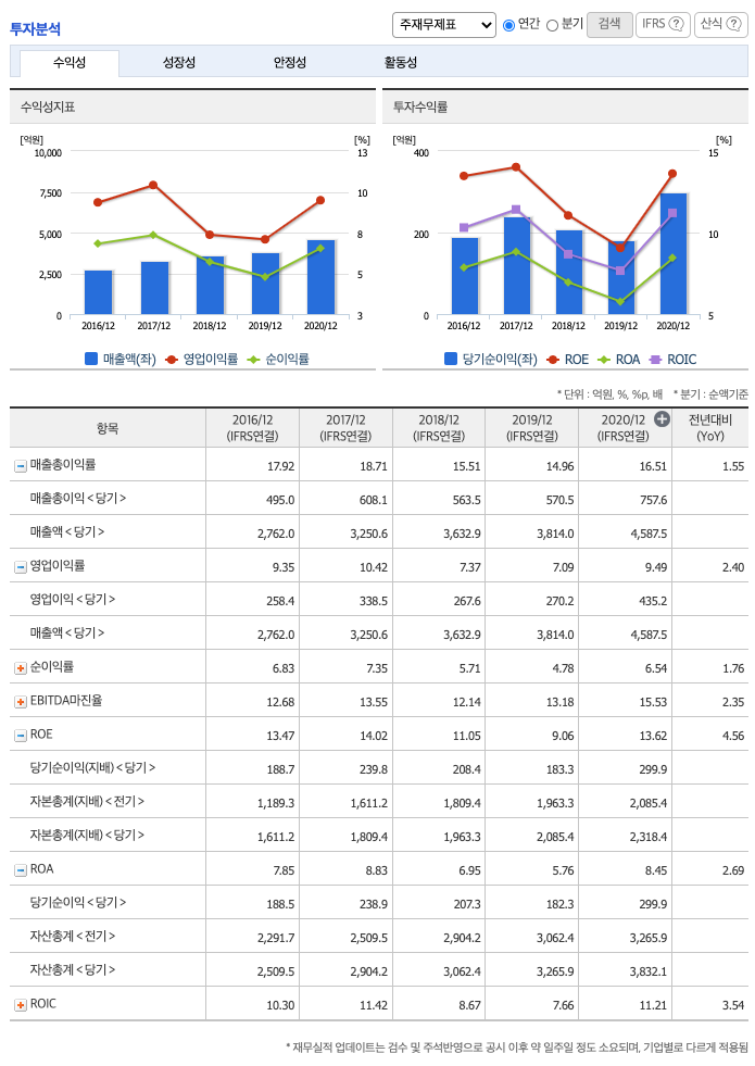 ROA(Return On Assets, 총자산순이익율, 경영자의 관점) : 2016년 약 7%, 2017년 약 8%, 2018년 약 6%, 2019년 약 5%, 2020년 약 8%이고, 총자산이익율은 이상율(10%)보다 낮습니다.