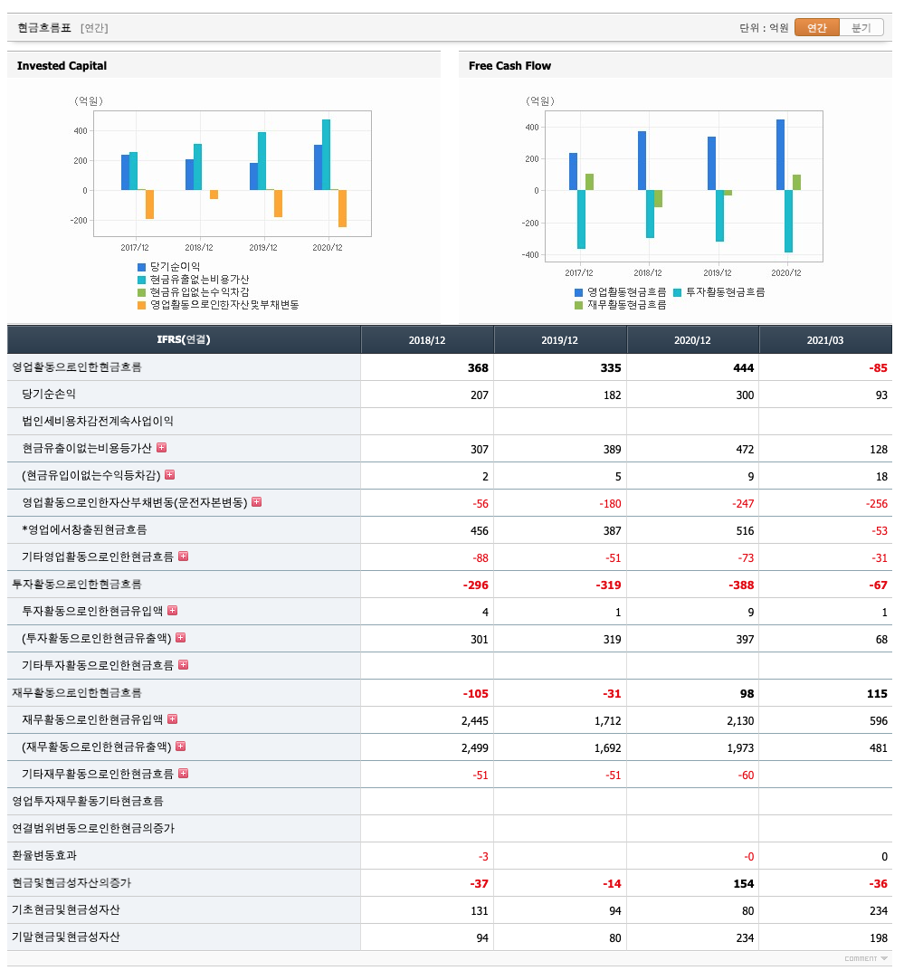 영업활동 현금흐름 : 2018년 368억원, 2019년 335억원, 2020년 444억원, 2021년 1분기 -85억원으로 2020년까지 영업활동 현금흐름이 원활합니다.