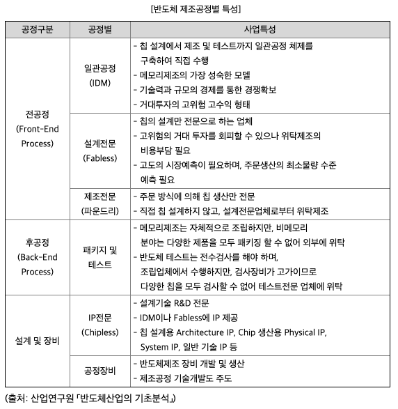 반도체란 구리처럼 전기가 잘 통하는 도체와 나무와 돌처럼 전기가 통하지 않는 부도체의 중간 성질을 갖는 물질을 말하며, 빛, 열, 불순물 등을 가하여 전기를 통하게 함으로써 전기 신호를 제어하거나 증폭, 기억하도록 가공된 전자부품의 일종입니다. 이러한 반도체는 크게 정보를 저장할 수 있는 '메모리 반도체', 정보 저장 없이 연산이나 제어기능을 하는 '비메모리 반도체'로 구분할 수 있으며, 장난감에서부터 우주항공산업에 이르기까지 그 적용분야가 매우 광범위 합니다. 더하여 최근의 자동차는 달리는 전자제품이라고 할 정도로 많은 반도체가 사용되고 있습니다. 이러한 반도체를 생산하기 위해서는 여러가지 제조공정과 반도체 재료를 필요로 합니다. 반도체 생산업체를 제조공정에 따라 구분하면 아래와 같이 크게 전공정(Front-End Process) 업체와 후공정(Back-End Process)업체 등으로 구분할 수 있습니다.