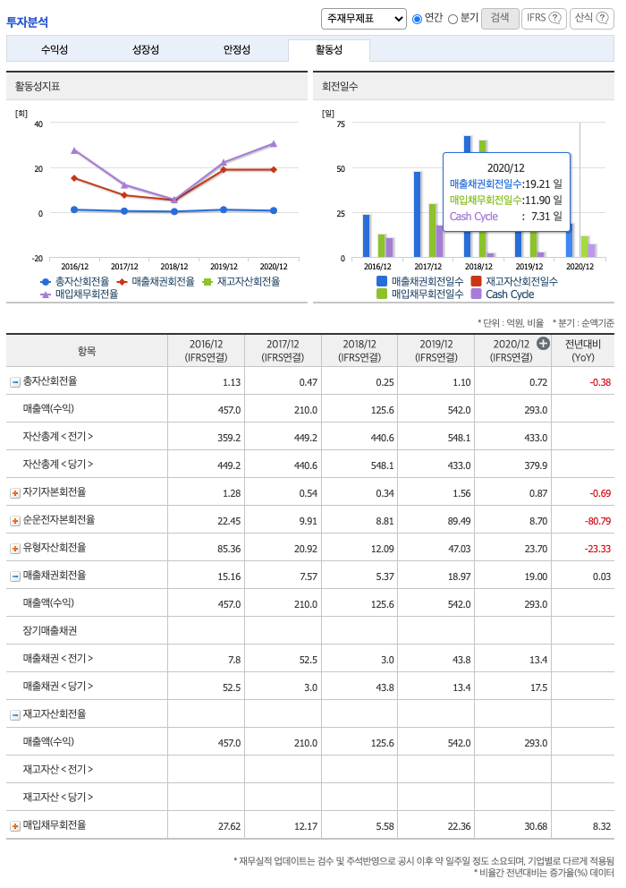 총자산회전율 : 2018년 약 548억원, 2019년 약 433억원, 2020년 약 379억원이고, 회전율은 2018년 약 0.25%, 2019년 약 1.1%, 2020년 약 0.72%로 총자산회전율이 낮아지고 있습니다.