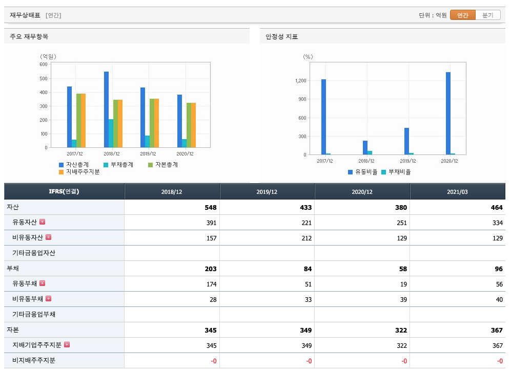 자산은 2018년 548억원, 2019년 433억원, 2020년 380억원으로 감소, 2021년 1분기 464억원으로 증가하였습니다.