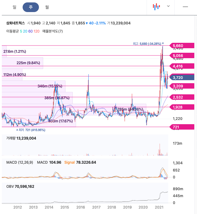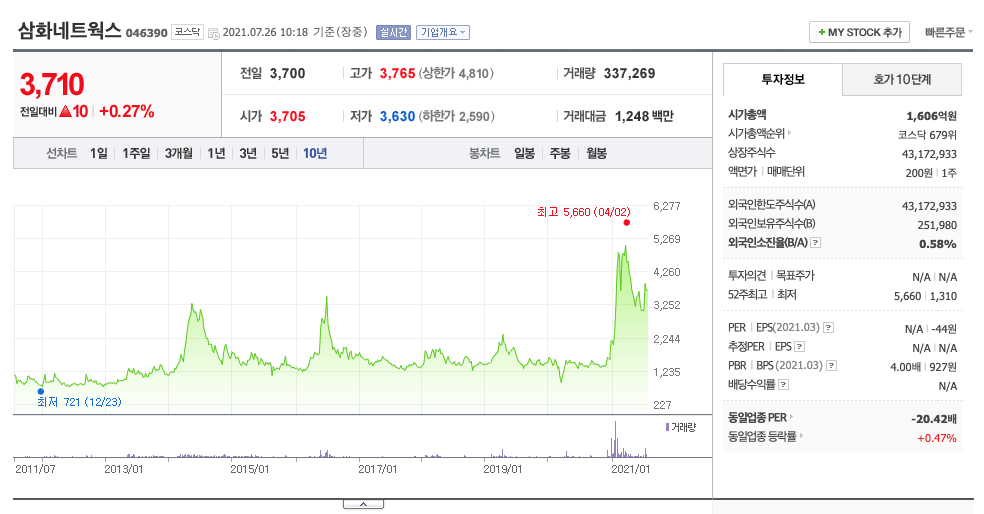 삼화네트웍스는 20년 12월에 주가가 급등하게 되어 21년 3월에 최고 5,660원을 찍고 조정을 받고 있습니다.
