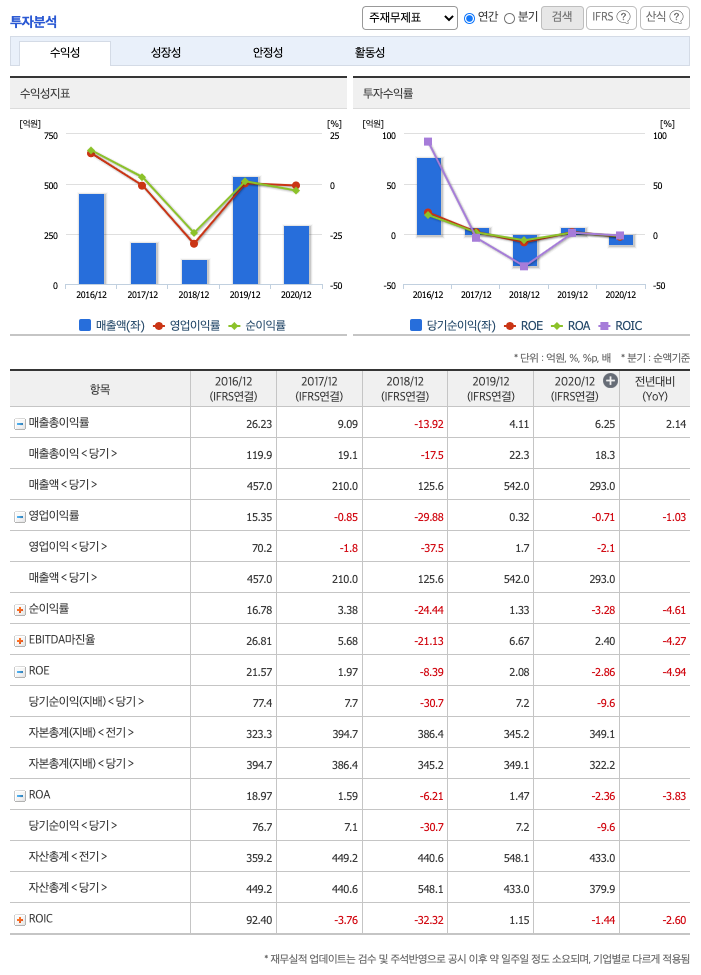 ROE(Return On Equity, 자기자본순이익율, 주주의 관점) : 2016년 약 21%, 2017년 약 1%, 2018년 약 -8%, 2019년 약 2%, 2020년 약 -2%이고, 자기자본순이익율은 이상율(10%)보다 낮습니다.