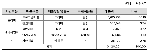 당사의 사업부문은 드라마 콘텐츠를 기획 및 제작하는 드라마 사업과 신인 연기자 발굴 및 관리하는 매지지먼트 사업으로 구분되어 있으며, 각 사업부문별 사업현황을 다음과 같습니다.