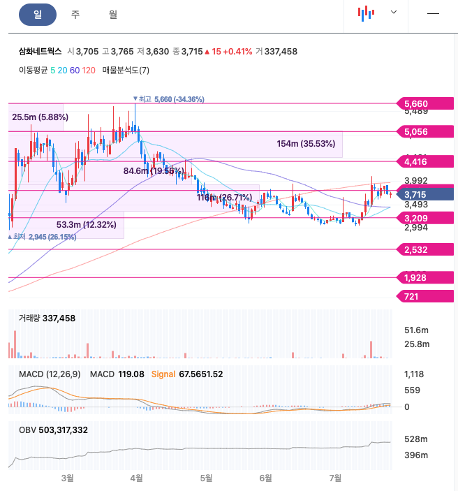 | 삼화네트웍스 | 3,740원 | 3,653원 | 3,554원 | 3,643원 |