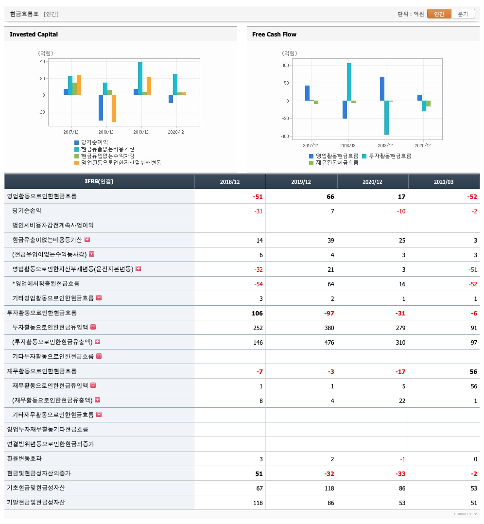 투자활동 현금흐름 : 2018년 106억원, 2019년 -97억원, 2020년 -31억원, 2021년 1분기 -6억원으로 2019년부터 투자활동 현금흐름이 원활합니다.