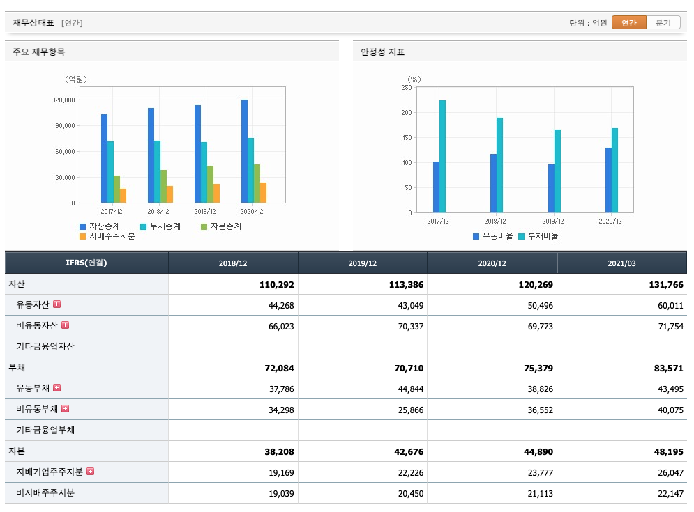 자산은 2018년 110,292억원, 2019년 113,386억원, 2020년 120,269억원, 2021년 1분기 131,766억원으로 증가 하였습니다.