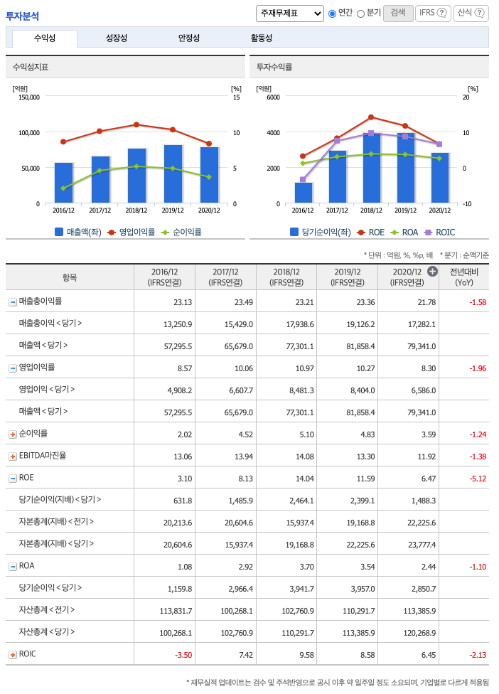 ROA(Return On Assets, 총자산순이익율, 경영자의 관점) : 2016년 약 1%, 2017년 약 2%, 2018년 약 3%, 2019년 약 3%, 2020년 약 2%이고, 총자산이익율은 이상율(10%)보다 낮습니다.