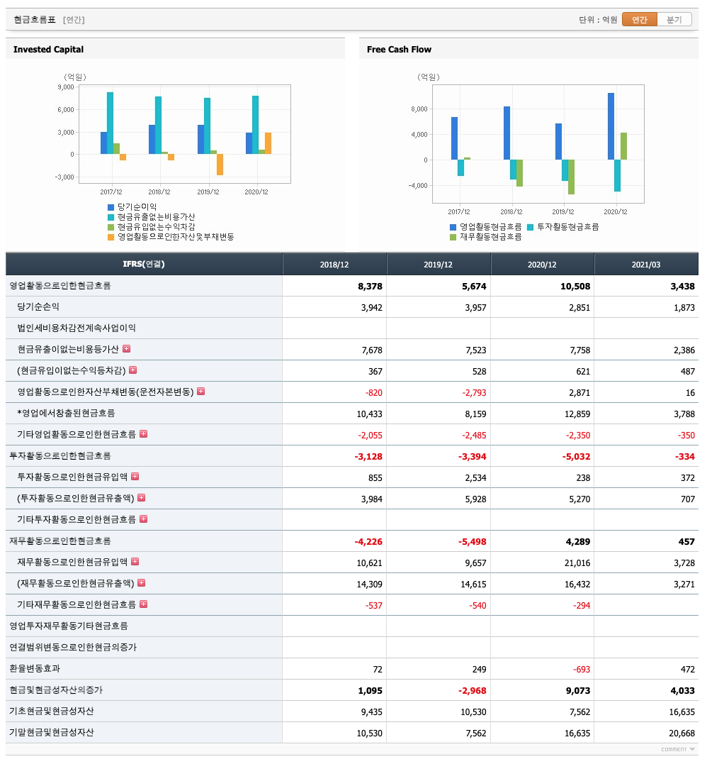 영업활동 현금흐름 : 2018년 8378억원, 2019년 5674억원, 2020년 10,508억원, 2021년 1분기 3438억원으로 영업활동 현금흐름이 원활합니다.