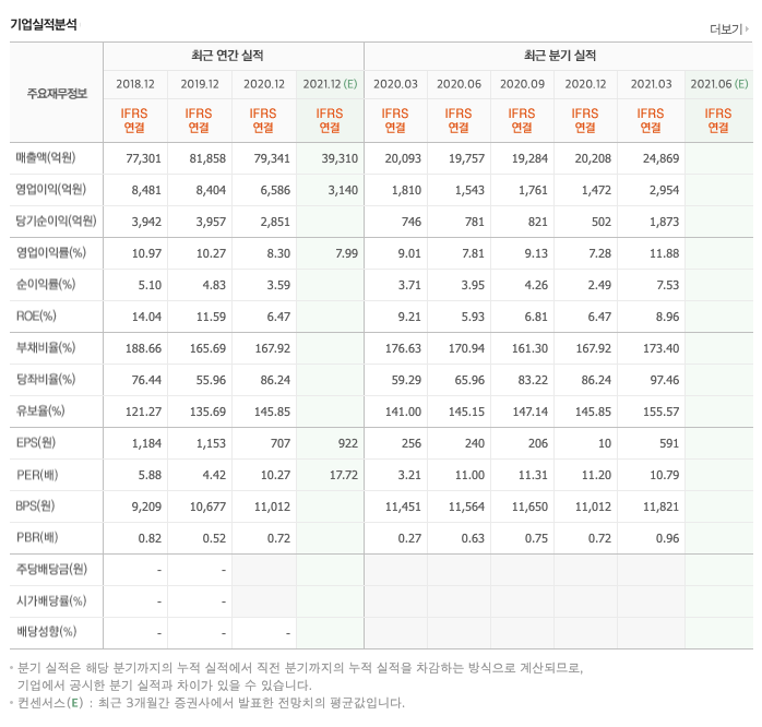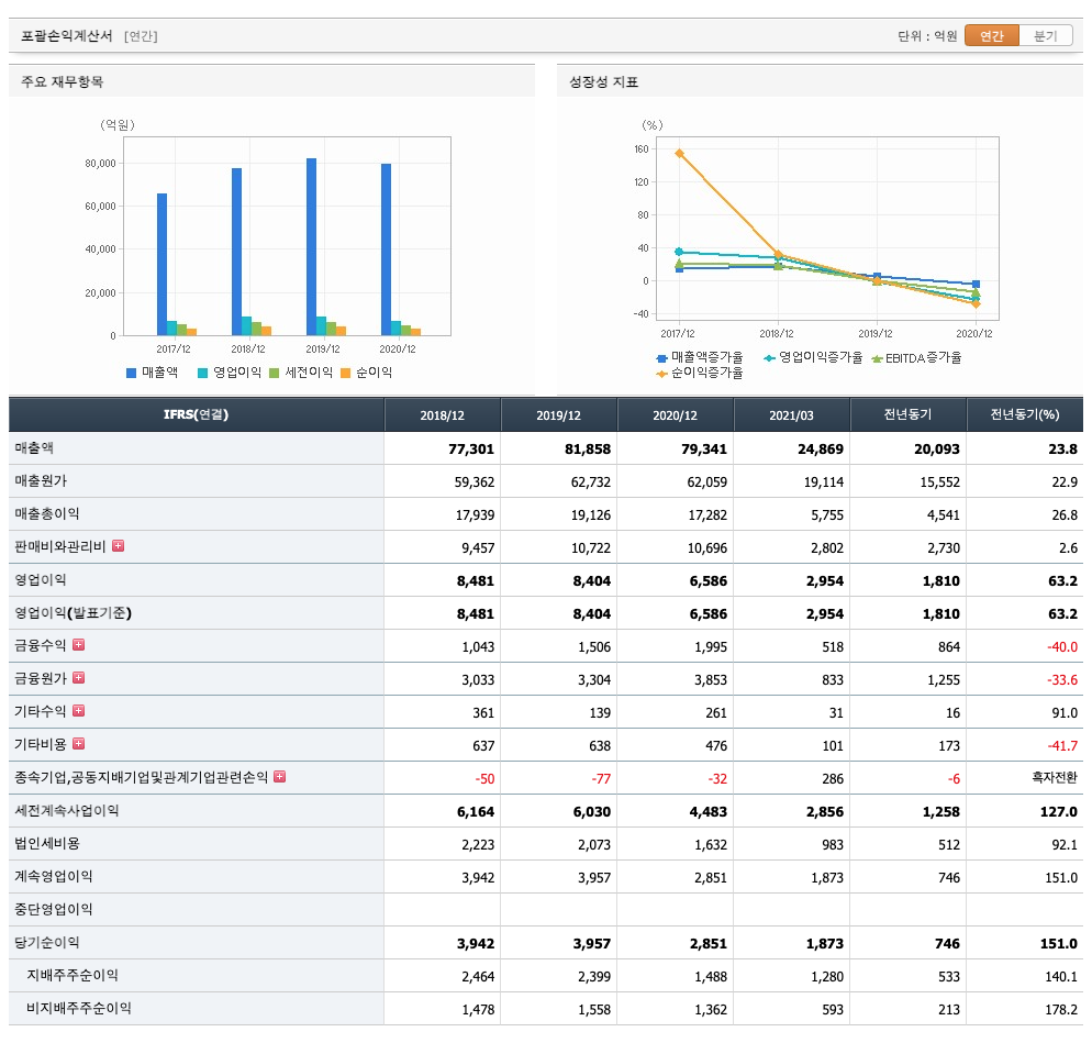 매출액 : 2018년 77,301억원, 2019년 81,858억원으로 증가, 2020년 79,341억원으로 감소, 2021년 1분기 24,869억원으로 전년동기대비 증가하였습니다. 2021년 1분기는 전년동기대비 23.8% 증가하였습니다. 2020년 분기별로 보면 2분기 19,757억원, 3분기 19,284억원, 4분기 20,208억원입니다.