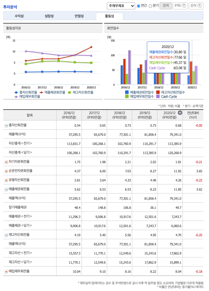 매출채권회전율(높을 수록 좋습니다) : 2018년 약 12,501억원, 2019년 약 7,243억원, 2020년 약 6,060억원이고, 회전율은 2018년 약 5%, 2019년 약 4%, 2020년 약 4%로 안정적입니다.