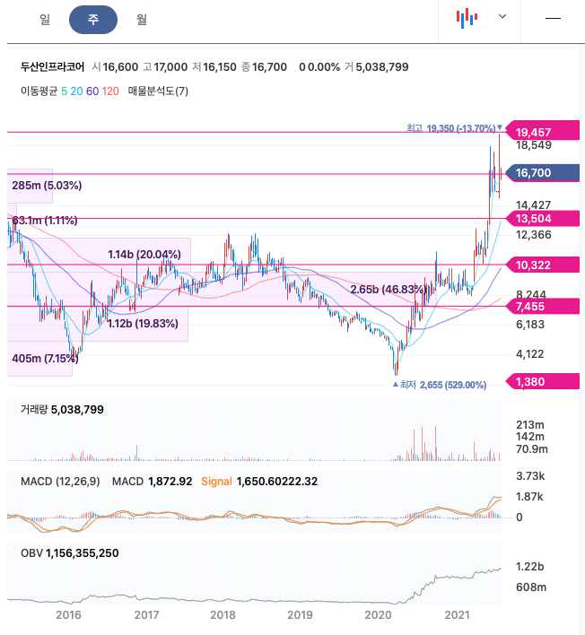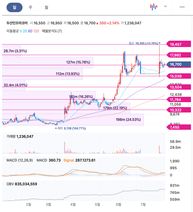 두산인프라코어는 21년 3월에 급등하였고, 이후 계속해서 증가하였고, 21년 7월에 최고 19,350원을 찍고 보합중에 있습니다.