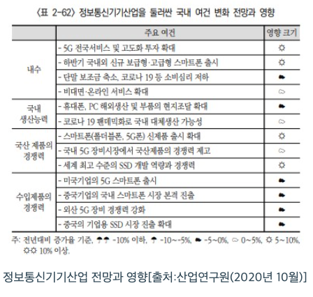 내수 시장은 코로나바이러스 감염증-19에 따른 소비심리 저하로 감소하였습니다. 2020년 상반기 내수는 5G 서비스와 윈도우10 교체수요 확대에도 불구하고 코로나바이러스 감염증-19의 영향에 따른 수요위축으로 전년 동기비 1.4% 감소하였습니다. 반면, 수출은 스마트폰이 크게 부진했지만 SSD 호조에 힘입어 증가하고 있습니다. 2020년 상반기 수출은 코로나바이러스 감염증-19 팬데믹화에 따른 글로벌 수요부진으로 스마트폰 수출이 크게 감소했지만, SSD 수출호조에 힘입어 전년 동기비 17.1% 증가하였습니다. 수입은 전년 수준에서 보합세를 유지할 것으로 전망됩니다. 2020년 상반기 수입은 휴대폰부품과 PC부문이 감소한 반면 휴대폰과 5G 통신장비, SSD 수입수요가 증가하면서 전체적으로 전년 동기비 1.6% 증가하였습니다. 코로나바이러스 감염증-19 영향에도 불구하고 국내 5G망 구축 투자와 신규 보급형 제품 출시 확대는 국내 산업 및 시장 확대의 긍정적 요인으로 작용할 전망입니다.