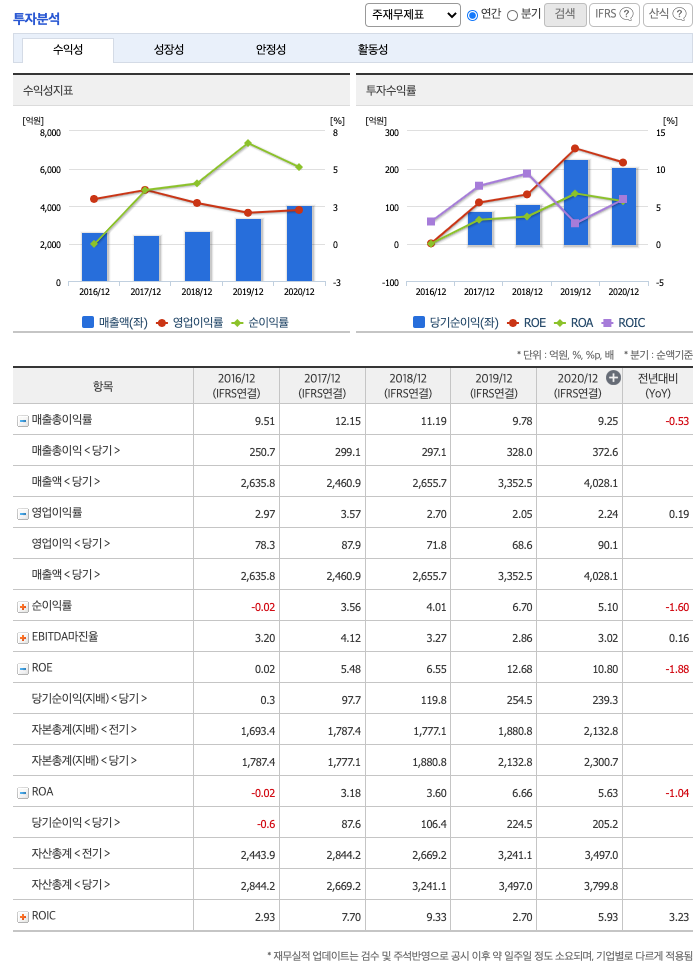 ROA(Return On Assets, 총자산순이익율, 경영자의 관점) : 2016년 약 -0.02%, 2017년 약 3%, 2018년 약 3%, 2019년 약 6%, 2020년 약 5%이고, 총자산이익율은 이상율(10%)보다 낮습니다.