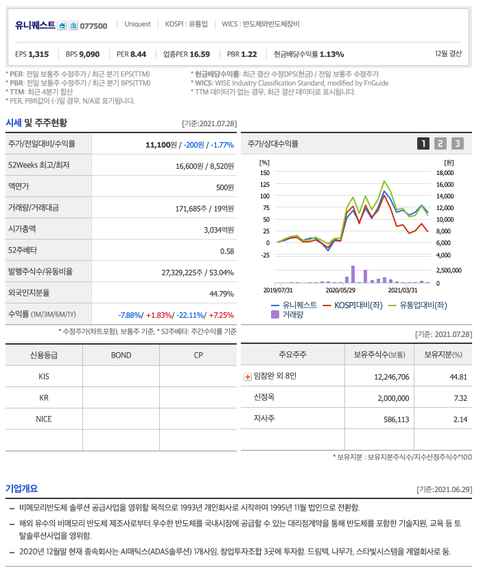 유니퀘스트는 주가가 20년 10월반등하였고, 21년 1월에 최고 16,600원을 찍고 조정을 받은뒤 보합중에 있습니다.