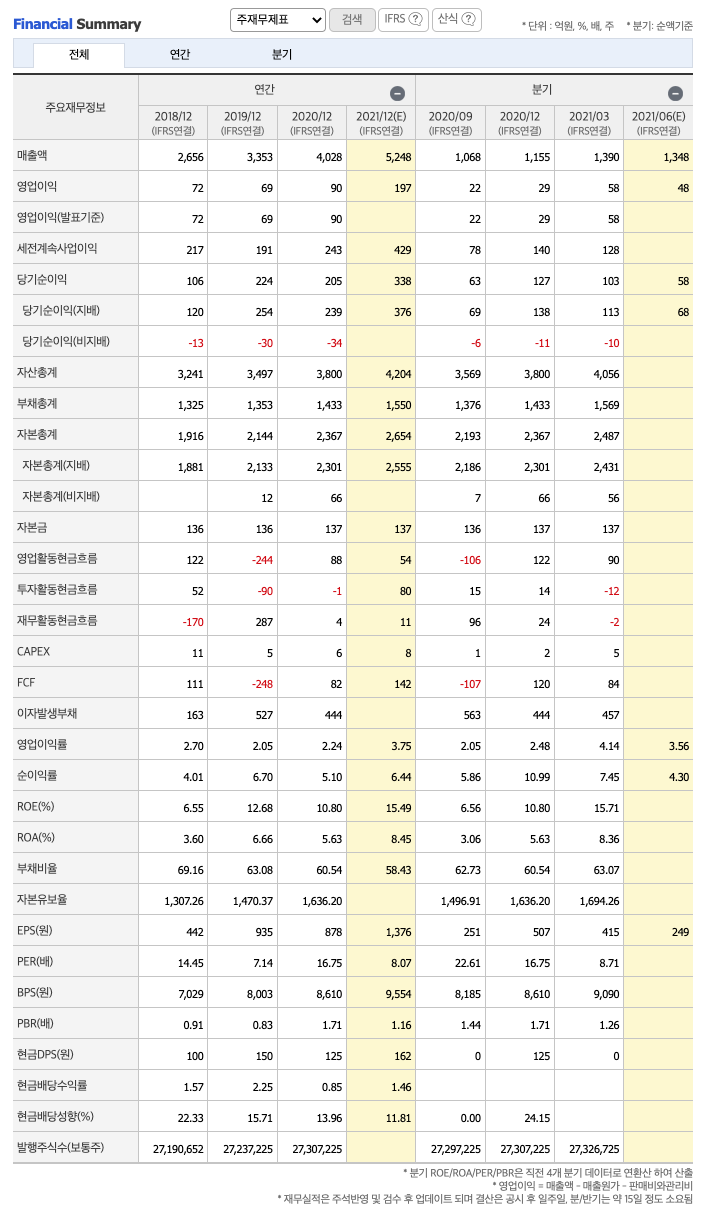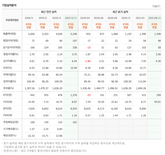 매출액 : 2018년 2656억원, 2019년 3353억원, 2020년 4028억원으로 증가, 2021년 1분기 1390억원으로 전년동기대비 증가하였습니다. 2021년 1분기는 전년동기대비 49% 증가하였습니다. 2020년 분기별로 보면 2분기 872억원, 3분기 1068억원, 4분기 1155억원입니다.