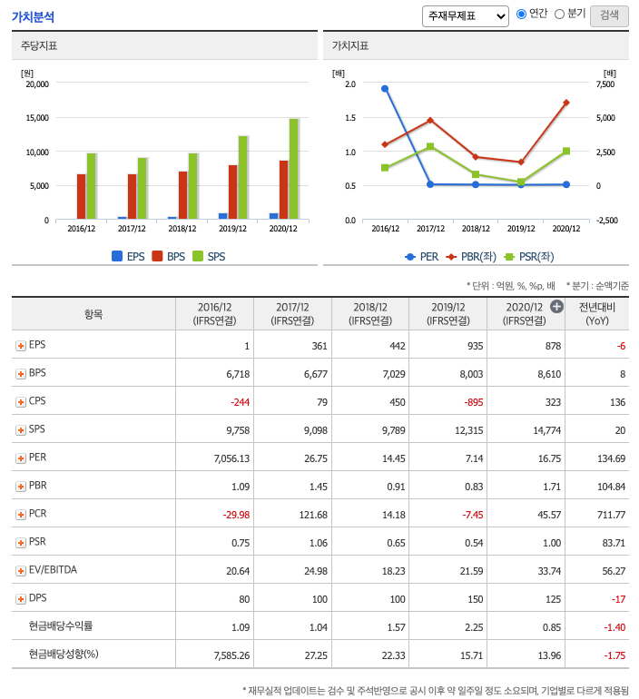DPS(Dividend Per Share의 약자, 총배당금을 총주식발생수로 나눈 것, 한 주당 얼만큼의 배당금을 받을 수 있는지 알 수 있는 지표, DPS가 높을 수록 배당금이 많은 것임) : 2016년 80원, 2017년 100원, 2018년 100원, 2019년 150원, 2020년 125원으로 전년동기 감소하였습니다.