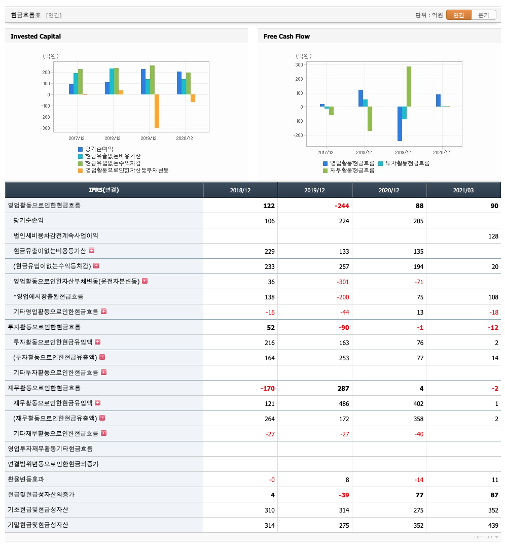 FCF(미래현금흐름) : 2018년 111억원, 2019년 -248억원, 2020년 82억원으로 미래현금흐름이 좋습니다. 2021년은 142억원으로 추정됩니다.