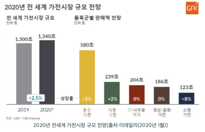 스마트 가전 분야의 국내 특허출원이 급증하고 있습니다. 국내 기업(연구기관 포함)이 전체 출원의 75.9%를 차지하며 출원을 주도하고 있습니다. 성숙 단계에 도달한 스마트 가전 분야에서 기업들은 인공지능기술 등 4차산업 분야와 융합한 스마트 가전을 통해 사용자의 다양한 요구를 만족시키며 새로운 시장을 개척하고 있습니다. 앞으로 국내 기업들은 스마트 가전 시장에서 해외 가전 기업들 외에도 구글, 아마존, 애플 등 글로벌 IT기업들과 경쟁할 것으로도 예상됩니다. 스마트 가전 시장의 발전은 반도체 시장에도 긍정적으로 작용할 것으로 보입니다. 주로 가전 제품의 두뇌역할을 하는 반도체 칩(MCU)이 스마트 가전 시장의 확대에 따라 수요가 증가하고 있기 때문입니다. MCU는 전자기기의 디스플레이, 타이머, 컴프레서, 냉장고, 세탁기, 에어컨 등과 같은 주요 가전제품의 모터를 제어합니다. 2020년 전세계 가전시장 규모는 2019년 대비 40조원 증가하여 1,340조원 규모로 성장했다고 예측됩니다.
