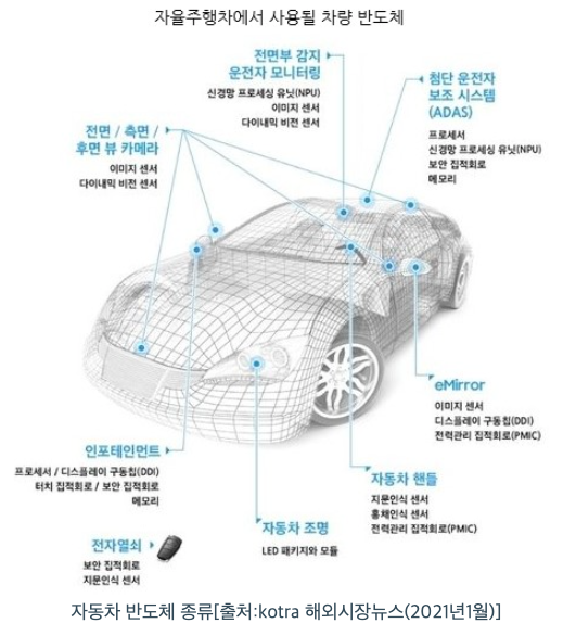 차량용 반도체 기술이 미래 자동차 산업의 승패를 좌우할 것으로 예상됨에 따라, 미래 자동차 시장을 선점하기 위하여 각국의 경쟁이 나날이 치열해지고 있습니다. 글로벌 시장조사기관 스타티스타(Statista)는 전세계적으로 차량용 반도체 시장 규모가 2020년에 450억 달러였으며, 2040년쯤에는 1,750억 달러까지 증가할 것으로 예측하고 있습니다. 현재 판매되고 있는 일반 자동차에 탑재되는 반도체 수가 약 200~300개 수준이라면, 레벨 3 이상의 자율주행차에는 2,000개 이상의 반도체가 필요합니다. 기존의 내연기관에 들어가던 부품들의 자리를 미래 자동차 시장에서는 반도체가 대신하게 되는 것입니다. 현재 사용되는 차량 반도체가 엔진 변속기 등 동력 제어, 바디제어, 내비게이션 등에 국한됐다면, 미래 자율주행차에서 사용되는 차량 반도체는 여기에 두뇌 역할을 하는 애플리케이션 프로세서(AP)를 비롯해 이미지 센서와 비전 센서 등을 아우르는 전면부 감지 운전자 모니터링 부문, 라디오 주파수 식별장치(RFID) 등으로 자율주행 레벨이 올라갈수록 그 범위가 계속 확대될 것입니다.