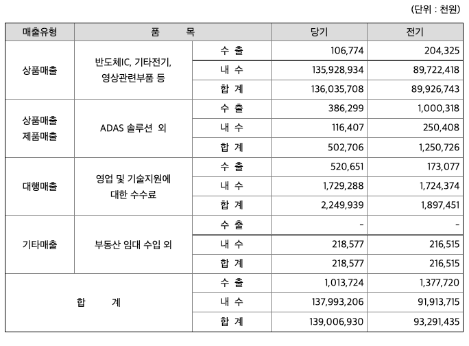 완제품의 IT 및 전자제품을 생산하기 위해서는 다양한 종류의 기능을 가진 반도체 제품을 필요로 하고 각 부품이 가지고 있는 기능이나 전기적 특성이 서로 다르므로 이들 부품들의 점유율을 비교하기란 매우 어렵다고 볼 수 있습니다. 또한 동일 제품에 대하여 국내에 다른 대리점이 존재하고, 당사에 영업권을 행사할 수 없는 국내 제조 업체들이 존재하는 복잡한 시장의 특성상 당사가 공급하고 있는 모든 제품의 시장 점유율을 판단하기는 매우 어려운 상황이며 이에 대한 공신력 있는 외부 연구기관의 자료 입수 역시 매우 어려운 관계로 따로 표시하지 않습니다.