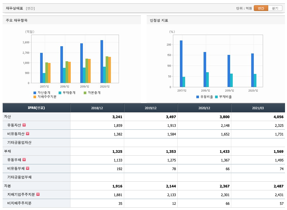 자산은 2018년 3241억원, 2019년 3497억원, 2020년 3800억원, 2021년 1분기 4056억원으로 증가하였습니다.