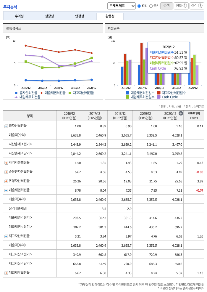 재고자산회전율(높을 수록 좋습니다) : 2018년 약 720억원, 2019년 약 686억원, 2020년 약 650억원이고, 회전율은 2018년 약 3%, 2019년 약 4%, 2020년 약 6%로 안정적입니다.