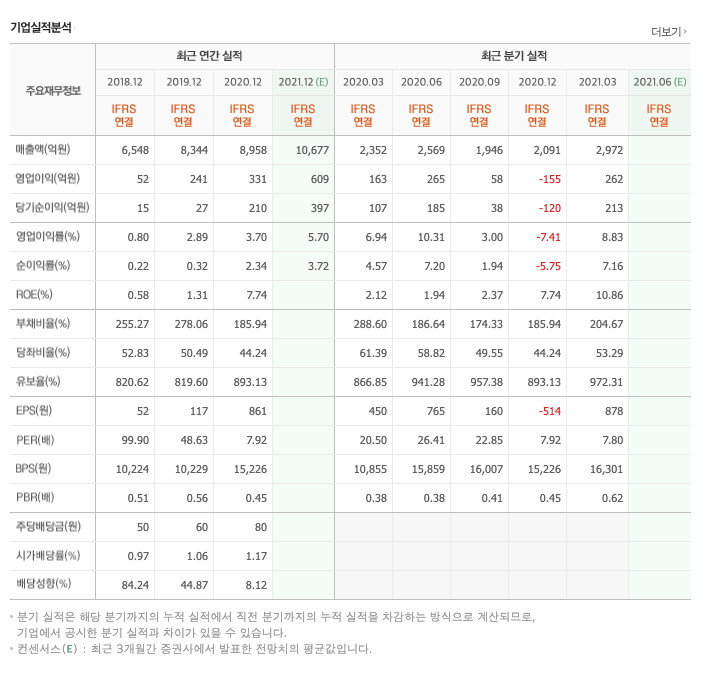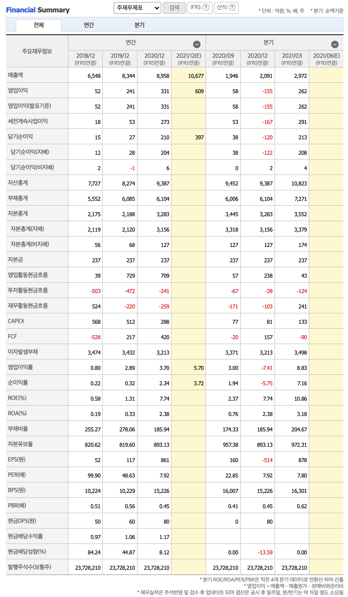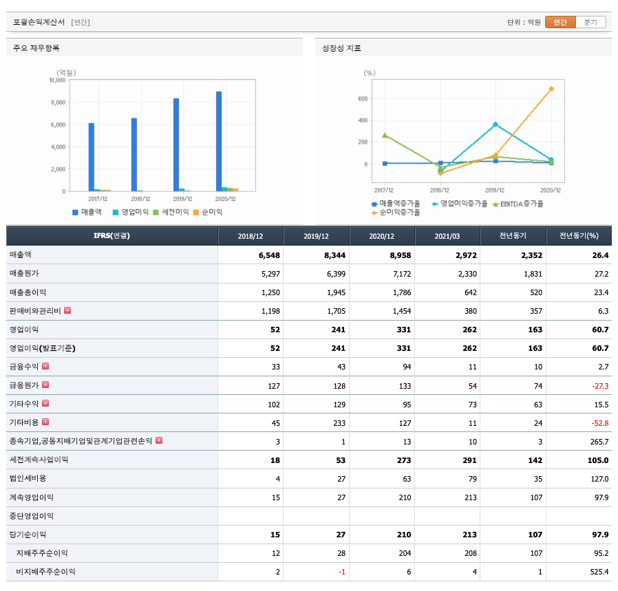 매출액 : 2018년 6548억원, 2019년 8344억원, 2020년 8958억원으로 증가, 2021년 1분기 2972억원으로 전년동기대비 증가하였습니다. 2021년 1분기는 전년동기대비 26.4% 증가하였습니다. 2020년 분기별로 보면 2분기 2569억원, 3분기 1946억원, 4분기 2091억원입니다.