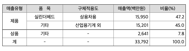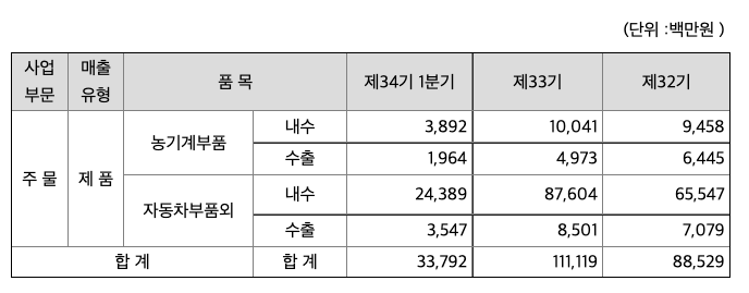 회사는 농기계, 산업기계 및 자동차용 주물소재를 생산, 판매 하고 있으며 주요 제품별 매출액 및 총매출액에서 차지하는 비율은 다음과 같습니다.