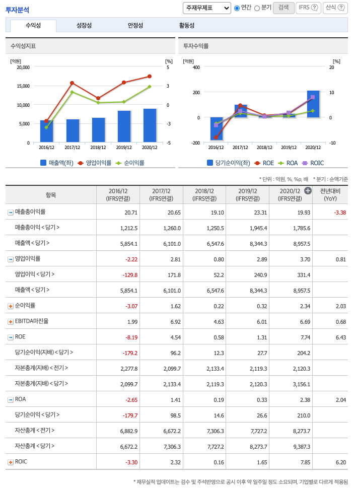 ROE(Return On Equity, 자기자본순이익율, 주주의 관점) : 2016년 약 -8%, 2017년 약 4%, 2018년 약 0.58%, 2019년 약 1%, 2020년 약 7%이고, 자기자본순이익율은 이상율(10%)보다 낮습니다.