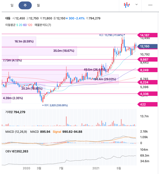 대동은 21년 1월에 주가가 상승하여 21년 5월 최고 13,750원을 찍고, 조정을 받았습니다.