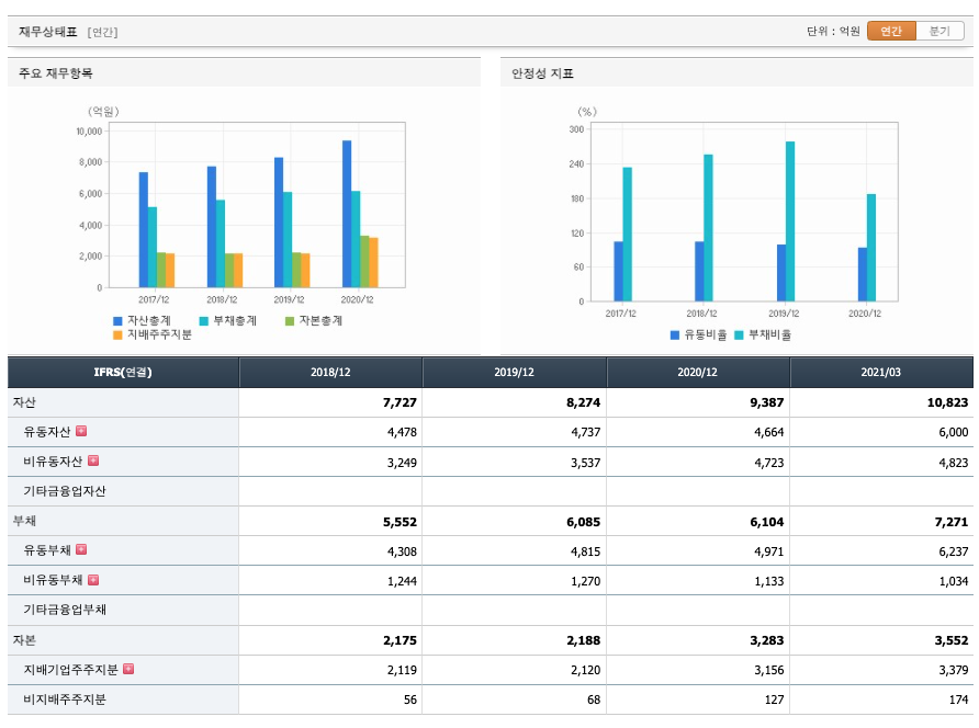 재무활동 현금흐름 : 2018년 524억원, 2019년 -220억원, 2020년 -259억원, 2021년 1분기 241억원으로 재무활동 현금흐름이 원활합니다.