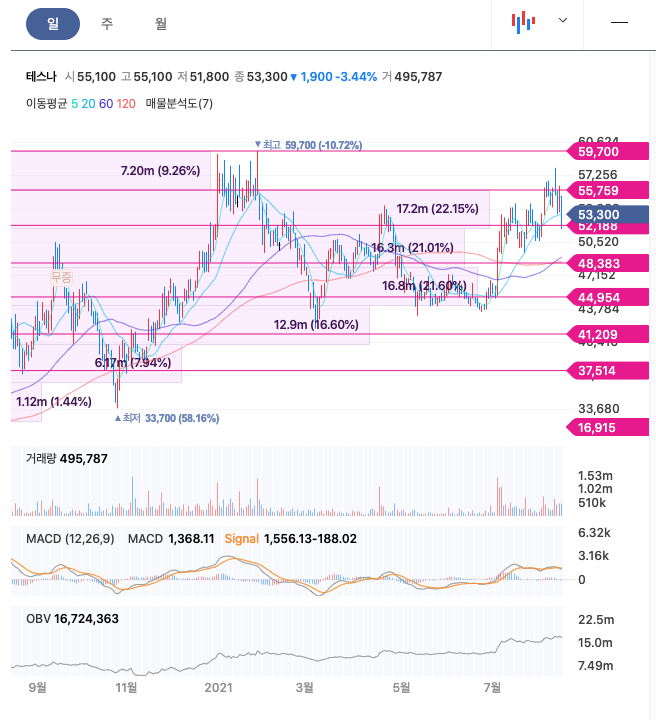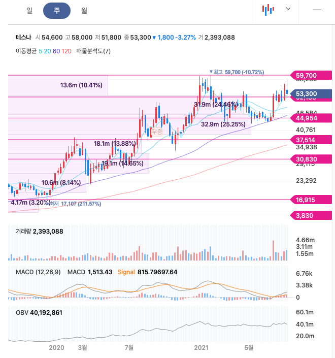 테스나는 20년 10월에 주가가 반등하여 21년 1월에 최고 59,700원을 찍고, 조정을 받은 뒤 최근 다시 반등을 하고 있습니다.