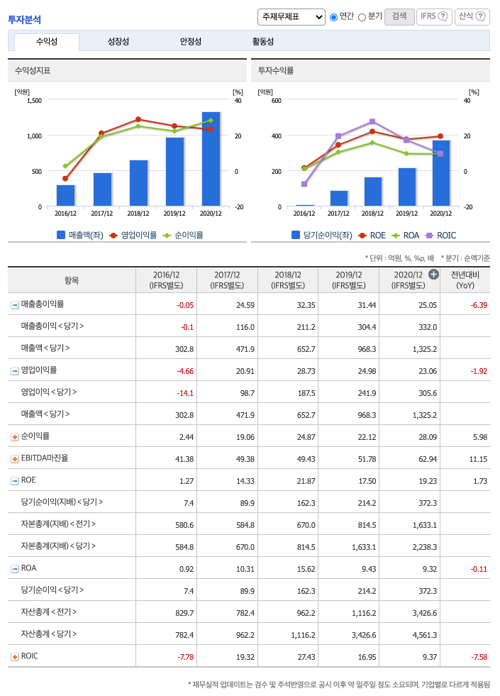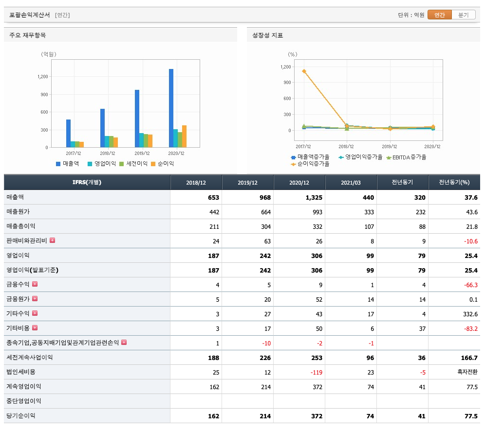 매출액 : 2018년 653억원, 2019년 968억원, 2020년 1325억원으로 증가, 2021년 1분기 44억원으로 전년동기대비 증가하였습니다. 2021년 1분기는 전년동기대비 37.6% 증가하였습니다. 2020년 분기별로 보면 2분기 317억원, 3분기 300억원, 4분기 389억원입니다.