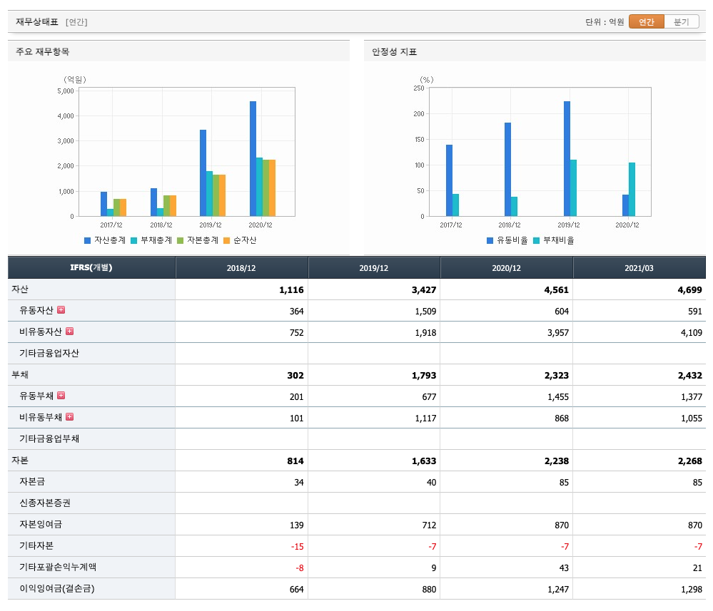 자산은 2018년 1116억원, 2019년 3427억원, 2020년 4561억원, 2021년 1분기 4699억원으로 증가 하였습니다.