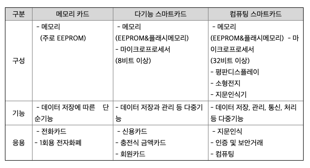 스마트카드는 플라스틱 카드에 초박형의 마이크로 프로세서 및ROM, RAM, EEPROM등의 메모리를 내장시킨 정보매체로써 컴퓨터 등의 기기와 인터페이스를 통하여 통신이 가능하고, 자체 프로세서를 내장하고 있어 연산이 가능하며, 기록매체로서도 활용이 가능합니다. 스마트카드는 인터페이스에 따라서 접촉형 카드와 비접촉형 카드로 분류되고, 카드 내부전원의 유무에 따라서 능동형과 수동형, 내장칩의 수량에 따라서 단일칩 카드와 다중칩 카드로 구분됩니다.