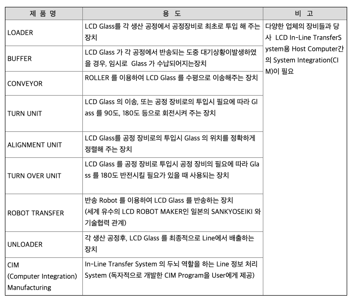 당사는 1996년부터 일본의 세계적인 Robot 전문 기업인 Sankyo Seiki와 기술 제휴하여 LCD 생산 Line의 Glass Transfer System의 In-Line화를 계획하고 개발하기 시작하였으며, 국내LCD Panel 제조업체와 2세대 LCD Line 설립 시 세계 최초로 MELSEC-NET이라는 하나의 Network 통신 방식을 통한 In-Line Transfer System을 도입하여 LCD Glass의 모든 정보를 관리할 수 있는 System을 구축 하였습니다. 그 결과 효율적인 생산 관리, 수율 향상, LCD 생산 Line의 자동화율 향상, 생산량 증가 등 많은 장점이 검증 되었습니다. 국내 LCD제조업체 중 당사 거래처의 5세대에서 8.5세대까지의 Line 설립시에는 당사가 독자적으로 개발하여 100% 국산화된 LCD In-Line Transfer System을 설치하여 현재까지 운영하고 있습니다. 현재 LCD Glass의 Transfer 관련 업계에서는 당사가 구축하여 운영중인 MELSEC-NET 기반의 LCD In-Line System이 업계의 표준으로 자리잡고 있습니다. 당사는 이러한 초기 개발 및 국산화 개발자로서의 이점과 탁월한 기술력을 바탕으로 LCD In-Line Transfer System 분야의 업계 선두자리를 유지하고 있습니다. 또한 LCD In-Line Transfer System 과 더불어 다양한 제품군 형성을 위하여 여러 형태의 LCD Glass Inspection System, Hot Air Oven System, HP/CP System 등을 생산 판매하고 있습니다. 최근 신규 개발된 10.5세대 제조장비는 우수한 Tact Time 대응 및 품질 향상에 많은 기여를 하고 있으며, 국내 및 해외에서 당사 제품을 채용 및 사용하고 있습니다.