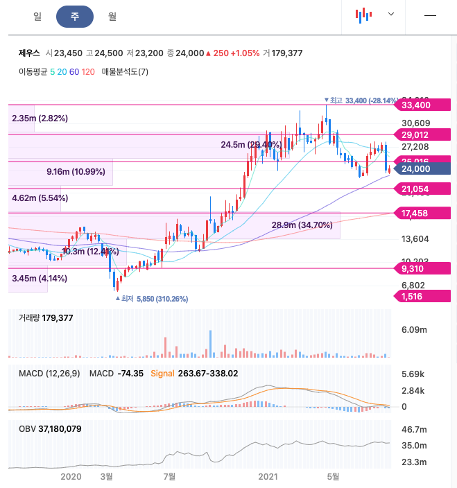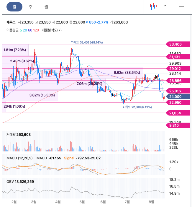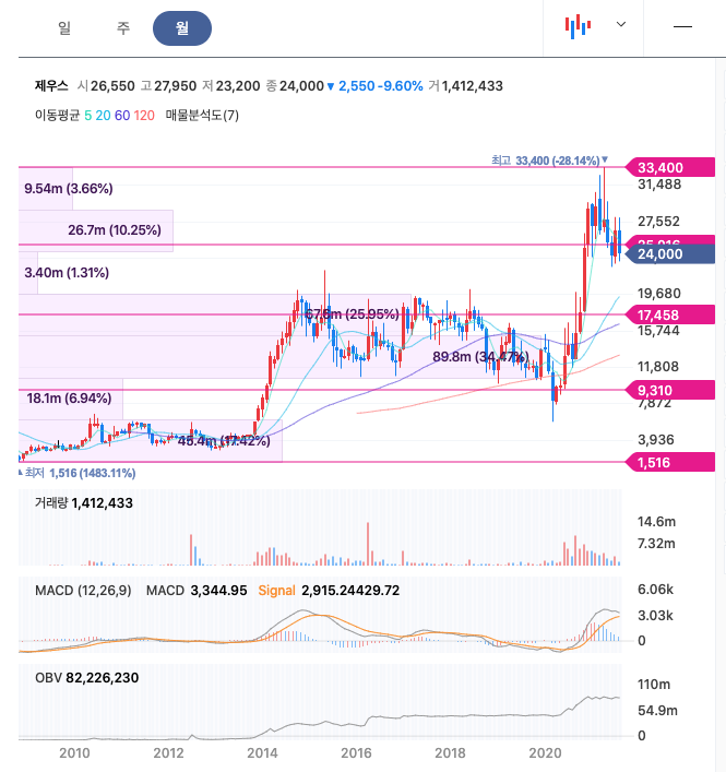 제우스는 20년 9월부터 주가가 증가하여 21년 4월 최고 33,400원을 찍고 조정을 받고 있습니다.