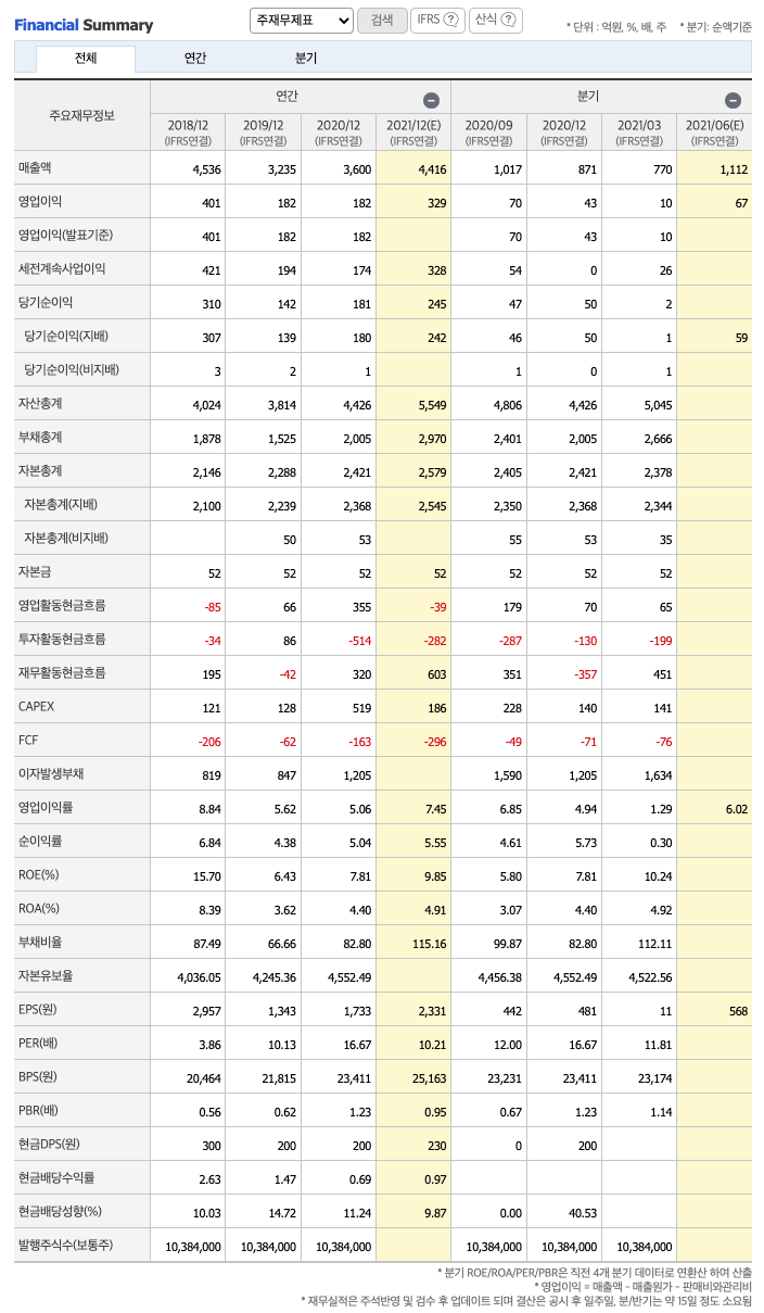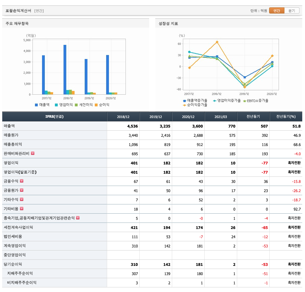 매출액 : 2018년 4536억원, 2019년 3235억원으로 감소, 2020년 3600억원으로 증가, 2021년 1분기 770억원으로 전년동기대비 증가하였습니다. 2021년 1분기는 전년동기대비 51.8% 증가하였습니다. 2020년 분기별로 보면 2분기 1205억원, 3분기 1017억원, 4분기 871억원입니다.