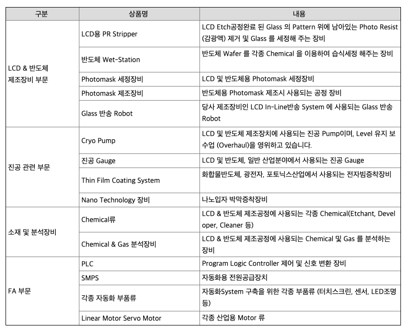 대략적인 당사 취급 제품을 소개하면 다음과 같습니다.