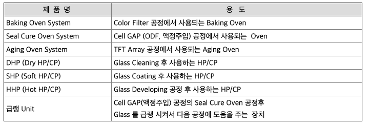 LCD 생산공정에서 사용되는 열장비의 일종으로 LCD CELL 공정에서의 핵심 장비로 이전 공정에서 도포한 액을 건조시켜서 다음 공정으로 배출하는 장비로써 LCD Glass 상면의 얼룩을 발생시키지 않도록 개발된 장비입니다.