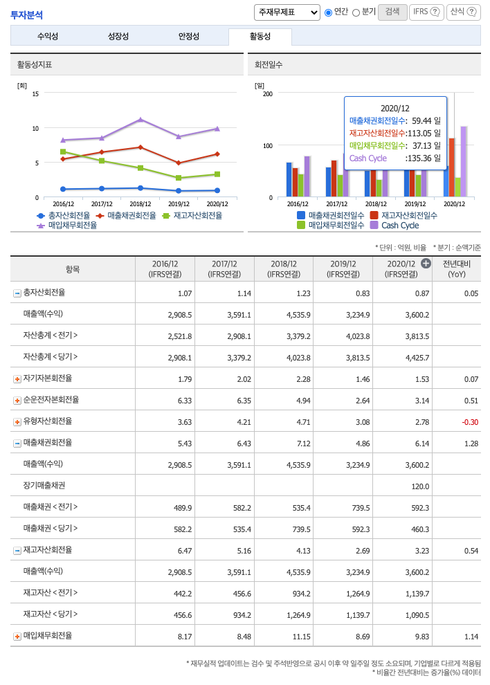 재고자산회전율(낮을 수록 좋습니다) : 2018년 약 1264억원, 2019년 약 1139억원, 2020년 약 1090억원이고, 회전율은 2018년 약 4%, 2019년 약 2%, 2020년 약 3%로 안정적입니다.