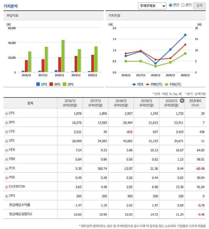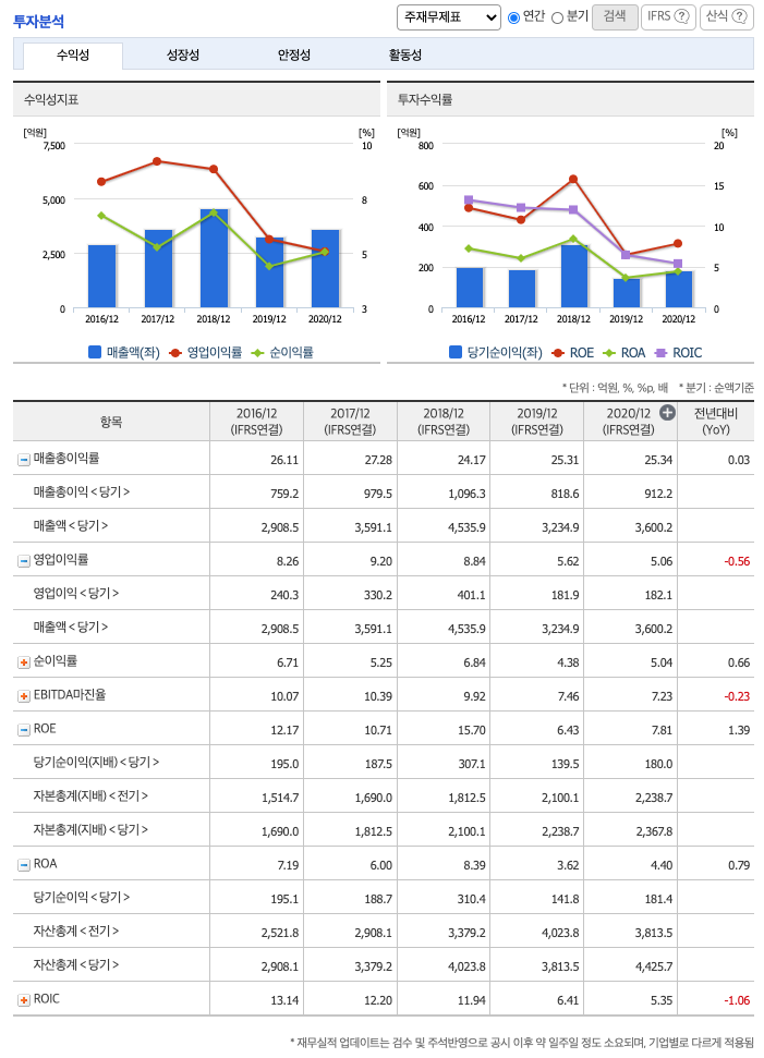ROE(Return On Equity, 자기자본순이익율, 주주의 관점) : 2016년 약 12%, 2017년 약 10%, 2018년 약 15%, 2019년 약 6%, 2020년 약 7%이고, 자기자본순이익율은 이상율(10%)보다 낮습니다.